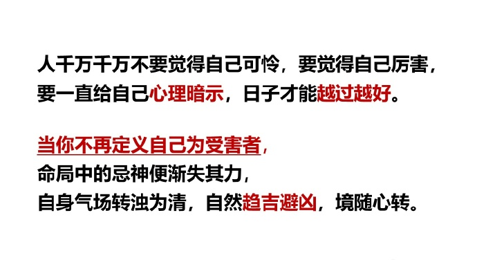 人千万千万不要觉得自己可怜,要觉得自己厉害,要一直给自己心理暗示,日子才能越过越好。